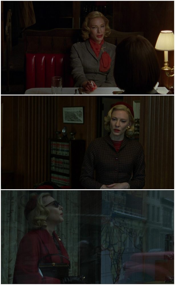 A figurinista do filme é Sandy Powell, cujos trabalhos em Velvet Goldmine (também dirigido por Haynes) e Cinderela já foram abordados aqui na coluna. Seu figurino ajuda a construir Carol como uma mulher madura, decidida e sem floreios. Embora a trama se passe na década de 50, ela não usa saias rodadas, optando por cortes retos e junto ao corpo. Além de cores neutras, como bege e cinza, tons de vermelho pontuam o figurino, quase sempre composto de tecidos lisos.