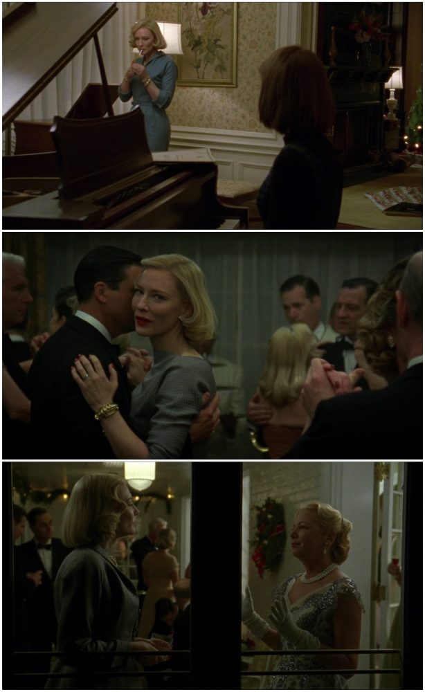 Em determinado momento do filme, em uma festa de amigos, a simplicidade da linha dos trajes de Carol contrasta com os de sua amiga, extremamente adornados.