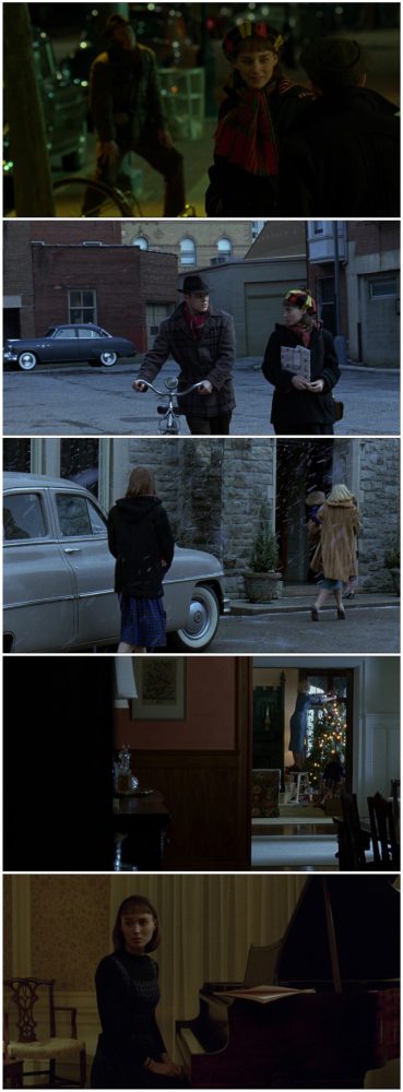 Em Carol, filme dirigido por Todd Haynes, baseado no romance de Patricia Highsmith e roteirizado por Phyllis Nagy, fica clara a decisão de retratar a história como um conto natalino. A personagem-título é uma dona de casa com boa situação financeira que está se divorciando do marido e Therese, por quem ela se apaixona, é vendedora e fotógrafa nas horas vagas. Uma boa parte dos acontecimentos ocorrem pouco antes do Natal no ano de 1952, até pouco depois do Ano Novo. A narrativa se encerra alguns meses depois. A paleta de cores em tons terrosos é contida, suave e pontuada por tons de verde e vermelho aqui e acolá, como a época de festividades pede. A fotografia é granulosa e esverdeada.