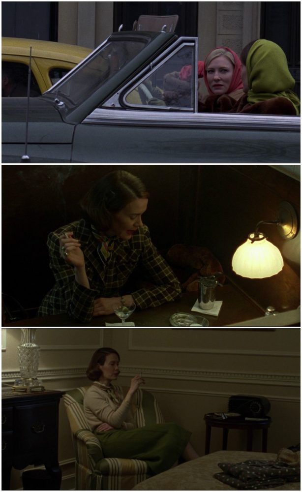 O uso de verde nas roupas de Therese torna-se ainda mais interessante quando percebemos ser a mesma cor utilizada por Abby (Sarah Paulson) amiga de Carol com quem esta teve um relacionamento no passado. Abby cuida de Carol e de certa forma também cuida de Therese, uma vez que ela ocupa agora o lugar de afeto na vida de Carol. A cor aproxima ambas, conectando-as a ela.