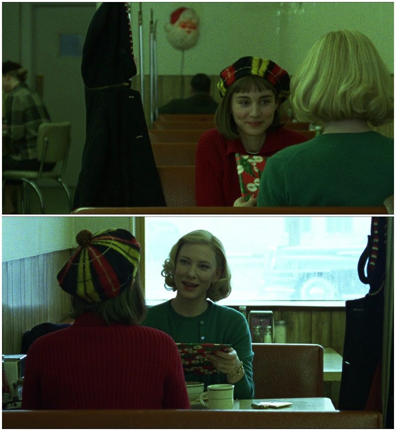 A conexão se estabelece também pelo fato de verde e vermelho serem cores complementares, ou seja, cores que visualmente se harmonizam em sua oposição. Quando Carol conhece o apartamento de Therese fica clara essa relação, não só nas cores, mas no posicionamento das atrizes.
