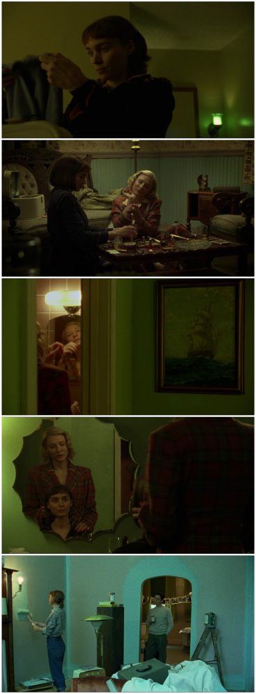 Além disso, o verde aparece marcadamente pelos lugares onde passam. Não é à toa que quando Therese retorna para seu apartamento, a cor é reforçada em suas paredes.