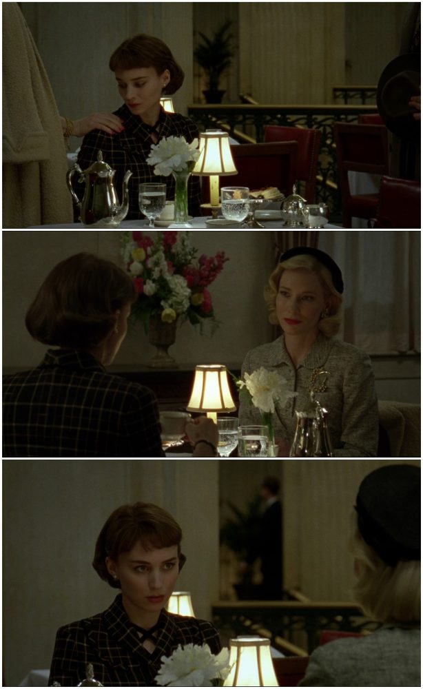 Na cena de abertura, que cronologicamente é uma das últimas, ambas têm um breve encontro como em Desencanto (1945), de David Lean. Desde a última vez que se viram, Therese se estabeleceu como fotógrafa de um jornal e sua mudança profissional já transparece em suas roupas. Agora ela já usa brincos, ainda que discretos e suas roupas estão mais elegantes. Rooney Mara emula a sofisticação sem esforços de Audrey Hepburn com precisão.