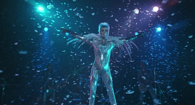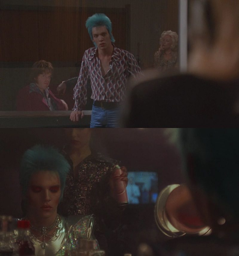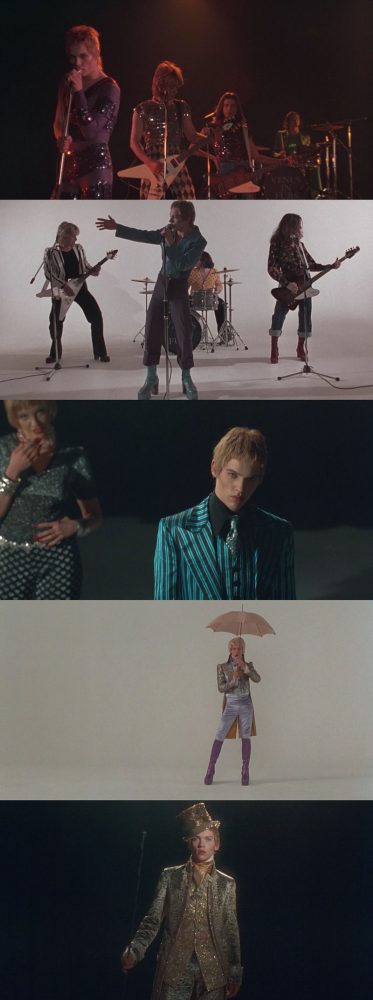 No começo de sua carreira, no final dos anos 60, Brian Slade toca em um festival usando um vestido roxo acompanhado de botas, similares aos que Bowie usa na capa de seu disco The Man Who Sold the World. O vestido era uma tentativa do personagem de transgredir os padrões da época, especialmente no que diz respeito às fronteiras entre masculino e feminino. A recepção da plateia à sua performance é morna.