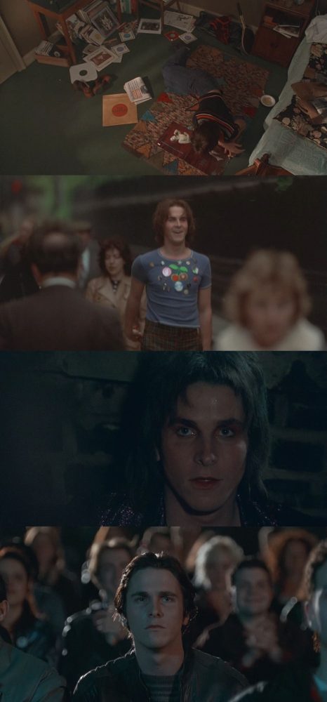 O ano é 1974. Brian Slade (Jonathan Rhys Meyers) está no auge de seu sucesso quando é baleado no palco durante uma apresentação. Dez anos depois, Arthur (Christian Bale), que ainda adolescente presenciou tudo da plateia, agora é um jornalista britânico morando nos Estados Unidos. Ele precisa ser alocado para investigar o acontecimento, que se sabe ter sido uma grande farsa que permitiu Brian sumir do mapa. Assim começa Velvet Goldmine, dirigido por Todd Haynes (Não Estou Lá). A figurinista é Sandy Powell, colaboradora nos últimos filmes de Martin Scorsese e também responsável por trabalhos memoráveis como Orlando - A Mulher Imortal, Entrevista com o Vampiro, A Jovem Rainha Vitória e, recentemente, Cinderela, que já foi analisado pela coluna.